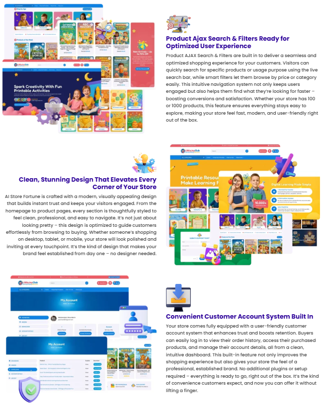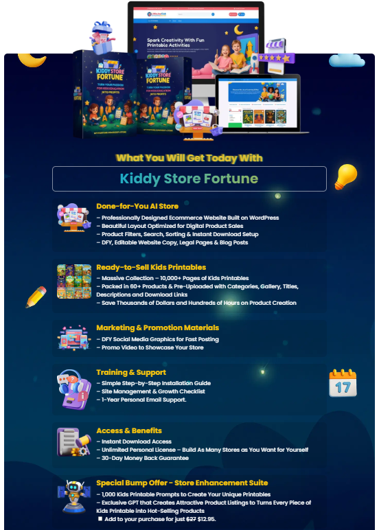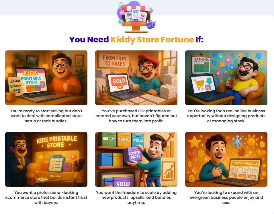 With its done-for-you setup, preloaded catalog of 10,000+ printables, sleek professional design, built-in customer system, and DFY promotional materials, Kiddy Store Fortune eliminates the biggest roadblocks to starting an online store. It takes you from idea to income in record time.