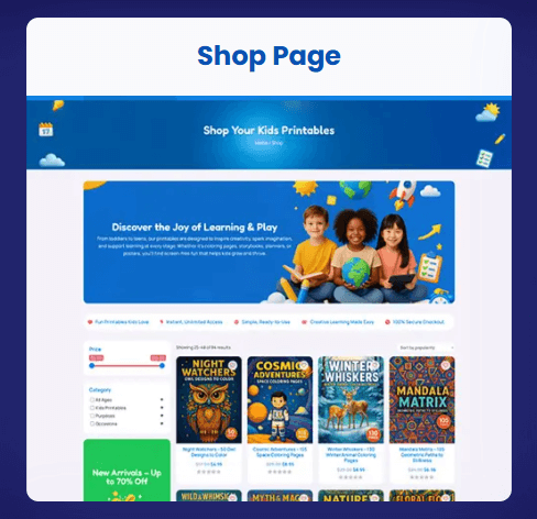Instantly launch a fully functional WordPress + WooCommerce kids’ printables store — no coding, no designing, no setup headaches.10,000+ Ready-to-Sell Kids’ Printables