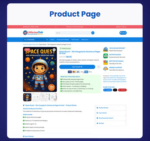 Built on WordPress with WooCommerce, this all-in-one system is loaded with over 10,000 ready-to-sell kids’ printables — including coloring pages, educational worksheets, activity books, planners, and more.
